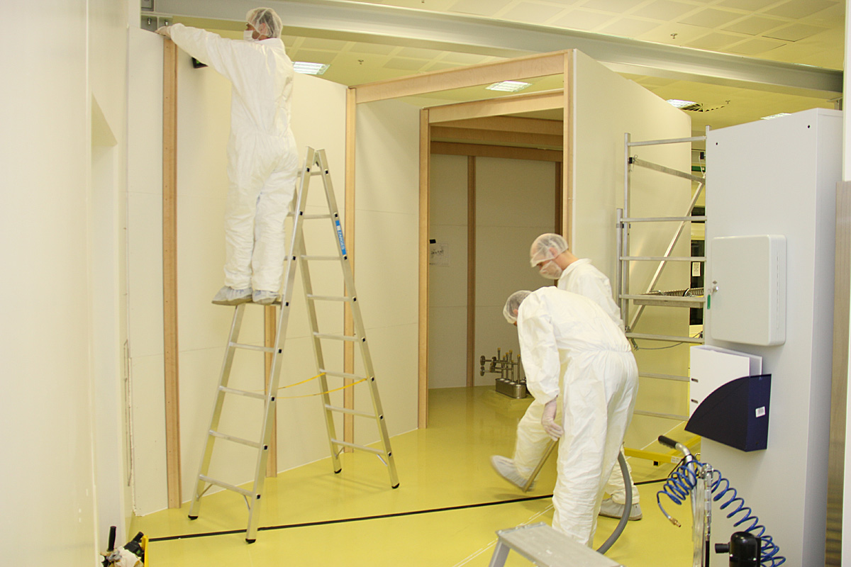 Unsere inzwischen perfektionierte Technik des Wandbaus mit Metall- oder beschichteter Holzprofile sowie umlaufend beschichteten Holzwerkstoffplatten ermöglicht Sonderkonstruktionen bis hin zu Dachflächen, die das Umstellen und Stilllegen von Anlagen oft unnötigt macht. Die Aufstellung erfolgt möglichst während planmäßiger Produktionsunterbrechungen. Nach Sonderreinigung, erfolgreicher Freimessung und Freigabe des Reinraums durch die Hygieneabteilung kann der Betrieb störungsfrei wieder anlaufen.